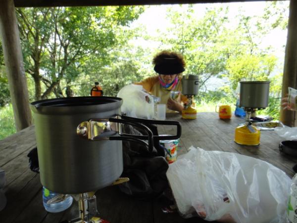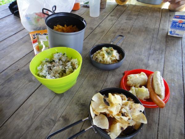 山頂の東屋で調理タイム。この○○会はお昼の調理にも力を入れているため、同行レポーターの私としても手を抜けない。どんどん作られる。おぉ、豪華だ。順不同に、ワカメじゃこご飯、ポテトサラダ、ボイルウィンナー、ペンネパスタ~うにの香りと共に~、チップス炒め、クリームソースパスタ、クリームコンソメスープ・・・