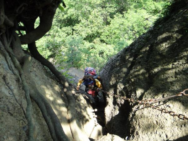 細かい砂利の下りが暫く続く。そして樹林帯のアップダウンを何度か繰り返し、本日のハイライト・兜岩の鎖場を存分に楽しませてもらった。細い岩の道、長めの鎖場。会長も構成員も、騒ぐかと思いきやそうでもなかった。楽しいと言っていただけて何よりである。