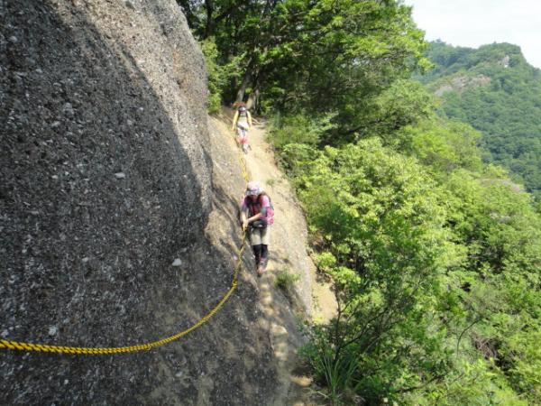 そして昼飯を食い過ぎたために、腹が痛くなった。惨劇としか表現しようもない。そうなるとこの道は苦行林に早変わりである。アップダウンが細かくあり、展望も一部を除いてききづらい。しかし歩けばいずれ着くもので、稚児落としへは予定コースタイムより気持ち早いくらいで着けた。相変わらずの高度感である。しかしほぼ無風のために暑い。