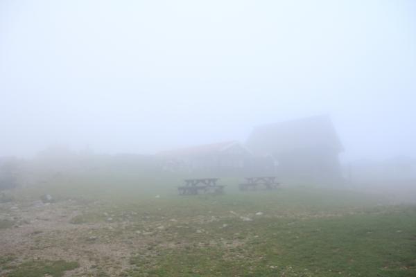 この時期の伊吹山は深夜~朝方はガスが発生することが多いそうです。結局ご来光は見ることが出来ず、強風で寒さを凌ぎながら食事をとって足早に下山しました。
