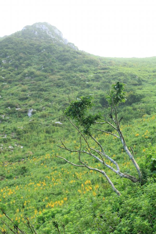 山頂に近づくにつれてガスが出始め、途中5m先が見えないほどの濃い濃霧になりました。