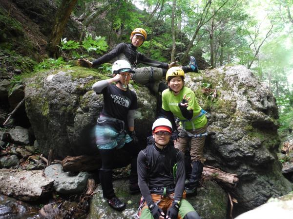 すぐに「勘兵衛ノ滝」が現れます。クライミングジムとは違う動きに戸惑いながらも、新人2人とも無事通過。