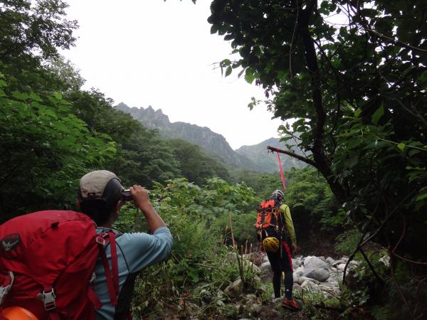 平坦な道と言えどアプローチ時間は長めなので、早く沢に入りたいと思いながら流れる汗を拭いつつ進みました。時々視界が開けそこから荒々しい岩壁が覗くと、ここは谷川岳なんだなあと改めて実感します。