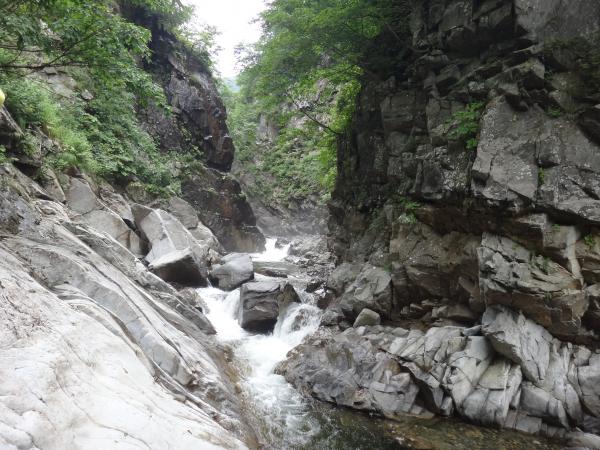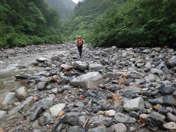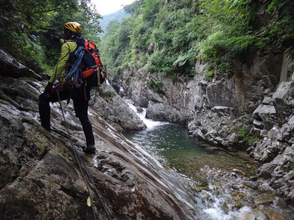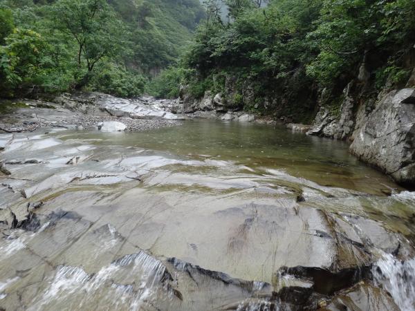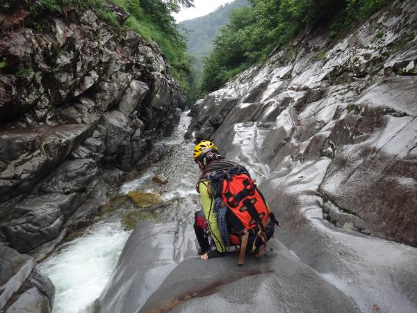 何とか核心部を過ぎ、見事なトイ状の沢筋左手に見ながら進みます。ゴーロ帯(河原)に差し掛かった頃には雨がポツポツ、やがて沢の癒しともいえる美しいナメが現れ心躍りましたが、私の気持ちとは裏腹に谷川のお空は御機嫌斜めのよう。残念ですがここで引き返す事となりました。