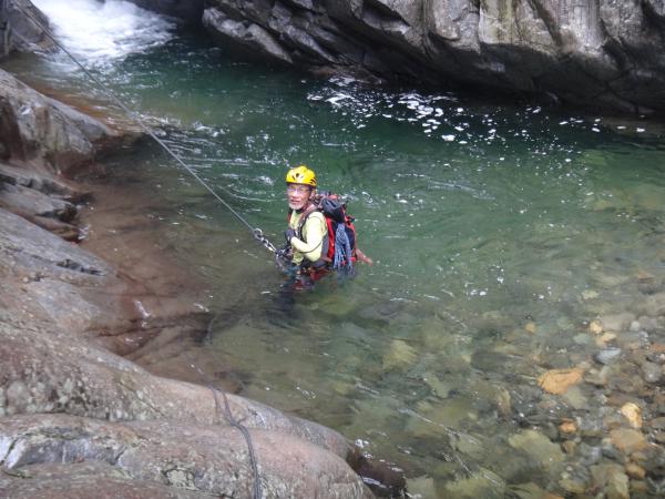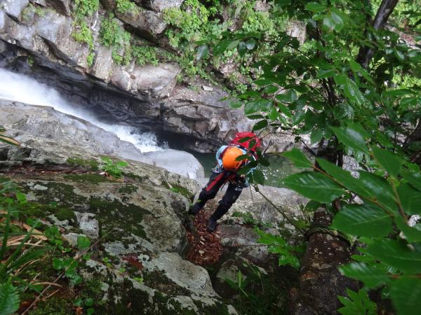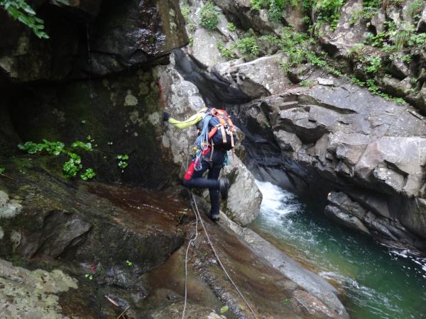 最初の核心部に戻ってドキドキの懸垂下降に挑戦。新発田の杉滝に続き2回目なので、まだまだ様になりませんが1回目よりはましになったかな?という感じでした。