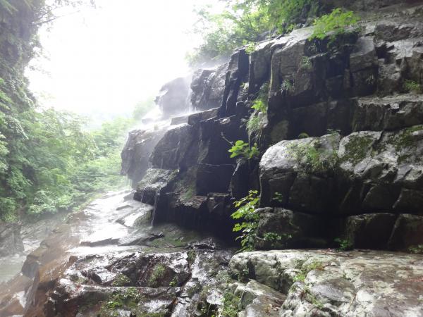半分泥だらけに状態で入渓点・武能沢出会に到着。いきなり激しい魚留の滝が待ち構えており圧倒されましたが、これは当然巻くのでホッ。としたのも束の間、右岸のハング気味の岩を登るはめに。佐藤ガイドは念の為といってザイルを出してくれましたが、私はザイル無しでは登れませんでした。