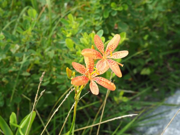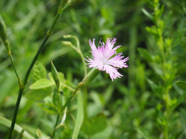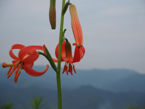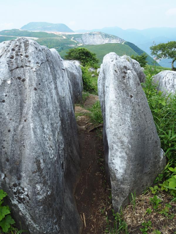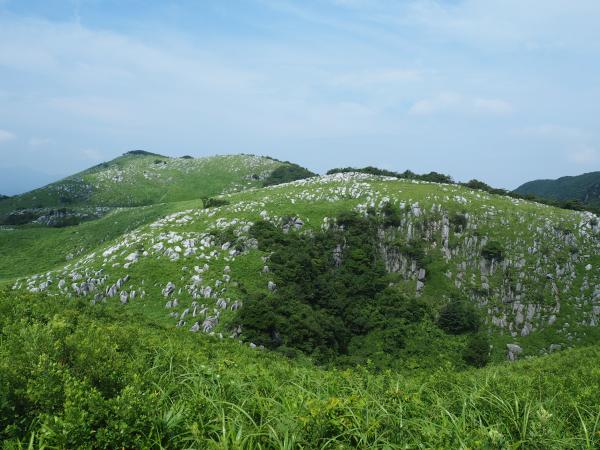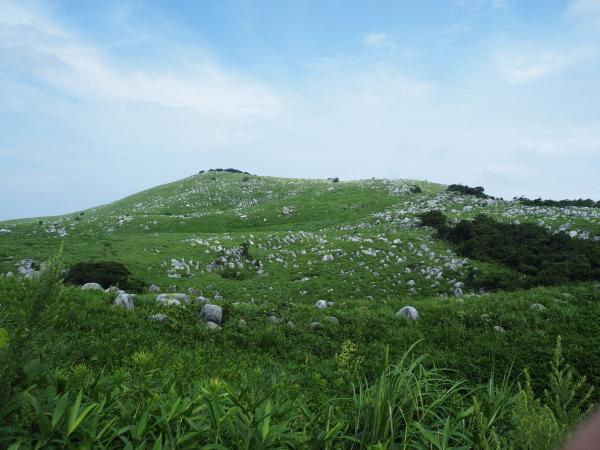 登ってすぐからノヒメユリがそこかしこに咲いているのが見られました。大平山まで急な登りが続きます。カルスト台地だけあって石灰岩がそこかしこに見えてきました。よく見るといろんな形をしていて面白いですよ。大平山の先の分岐で中峠方面へ。真っすぐ四方台へも行けますがガイドブックには少し遠回りでもこのコースが眺めもよくオススメと書いてあったので。中峠までは緩やかな下り。少し行くと有名な羊群原が見え始めました。ふと振り返ると山肌の石灰岩がホント羊の群れのようです。途中に休憩用のベンチ&テーブルなどもありこの景色を眺めながらゆっくり休憩するのもいいかもしれません。