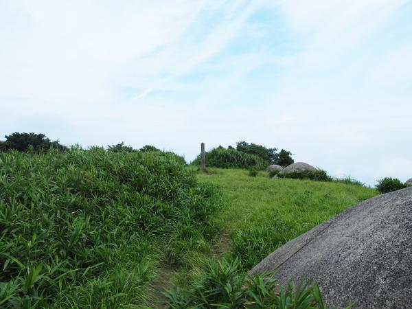 無事合流地点に着くとそこにはケルンがありました。合流後少し登ると四方台です。大平山から遠回りせず直進するとここで合流することになります。さぁ、あとひと登り。が、このひと登りが核心でした。ほどほどの傾斜な上になんと登山道が粘土質になっていて滑る滑る。所々コケまで付いていてかなり慎重に歩きました。なのにあとちょっとのところでつまづき、ザックのサイドポケットに入れていた水筒が落ち、止まってくれるはずもなくコロコロ、、、どこまでいっちゃうのー(泣)水筒を救出しに戻りまたこの滑る道をひと登り。ようやく山頂に到着です。山頂はほど良い広さと北九州市街や周防灘、響灘などの展望を楽しめます。今日は若干霞んでいましたが。ここでしばしの休憩。