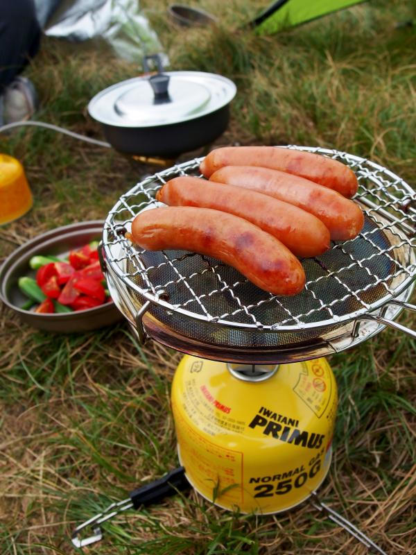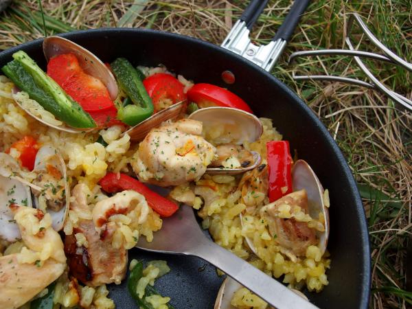 まずテントを張り終えると、温泉は食後のお楽しみにしておいて、早速晩ごはんの仕度。メインのパエリアは大きめのフライパンと「尾西の白飯」や、常温保存可能でそのまま使えるアサリの真空パック(スーパーで手に入ります)などを使い、意外と簡単に作れます。ウインナーを焼く時は枝豆などをつまみながら、弱火でじっくり焼と良いでしょう。