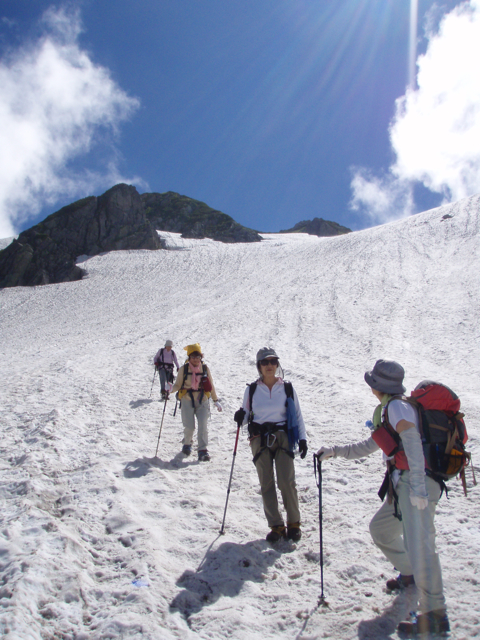 - 剱御前山からクロユリのコルは通行止め 当パーティーはピッケル、アイゼン、ロープ使用で剱沢へ下降しました。