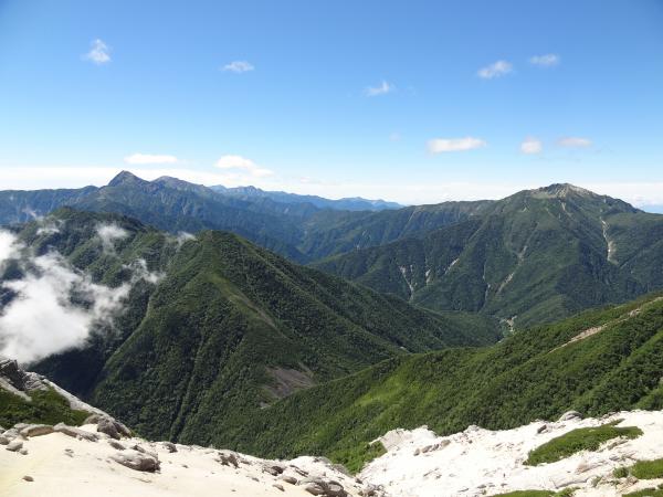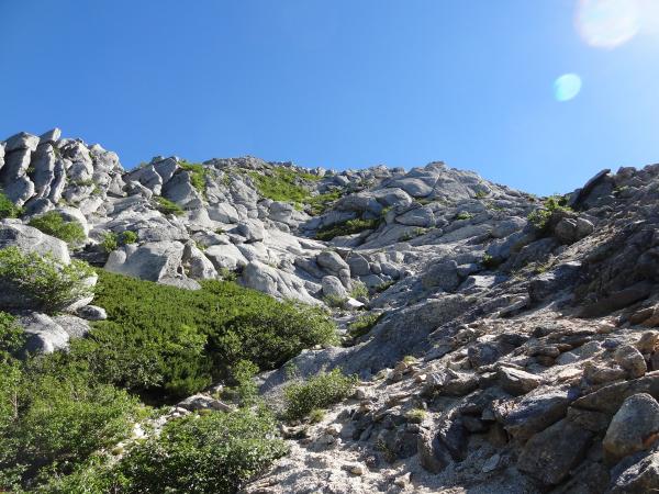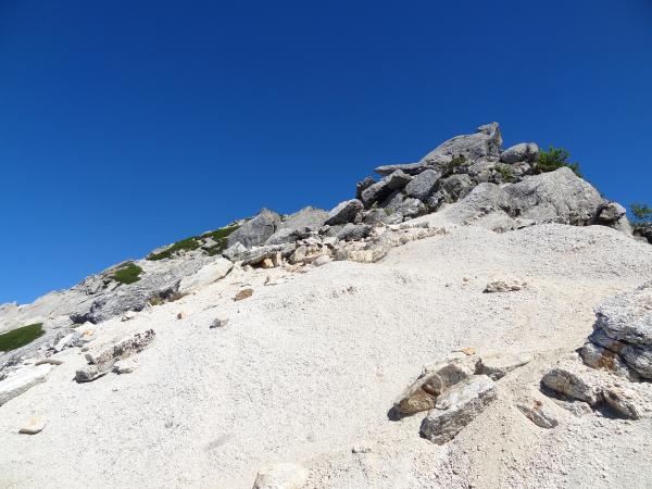 明るい砂礫の稜線を歩き、黒戸尾根からの登山道が合流すれば山頂です。