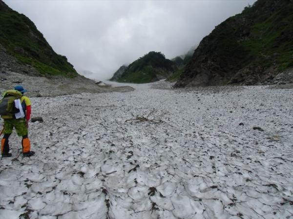 1時間くらい上がって、ちらちらっと雪渓が見えてきます。
