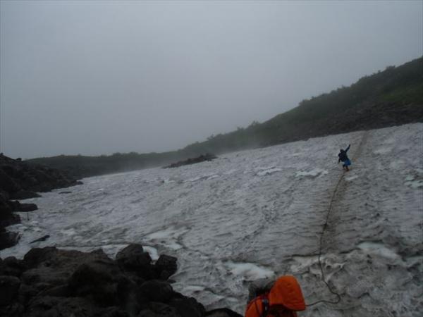 雪渓はしっかりアイゼン効いて、問題なし。足元ふらつくのでストックあるといいかもしれません。