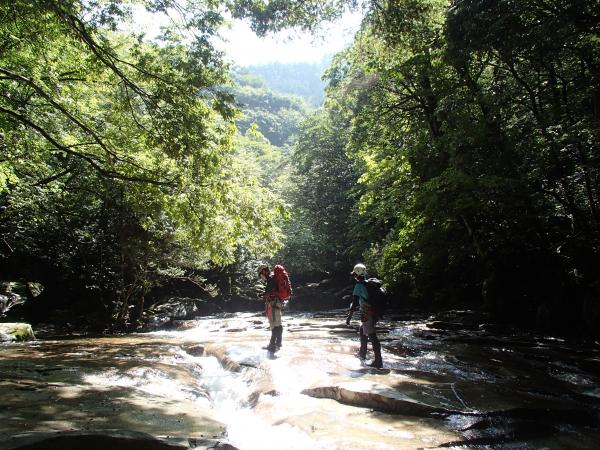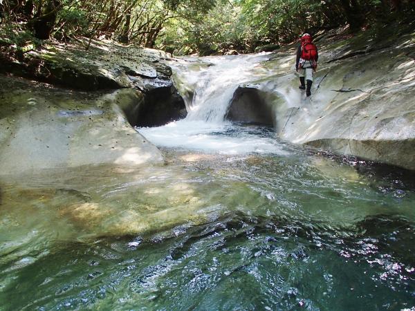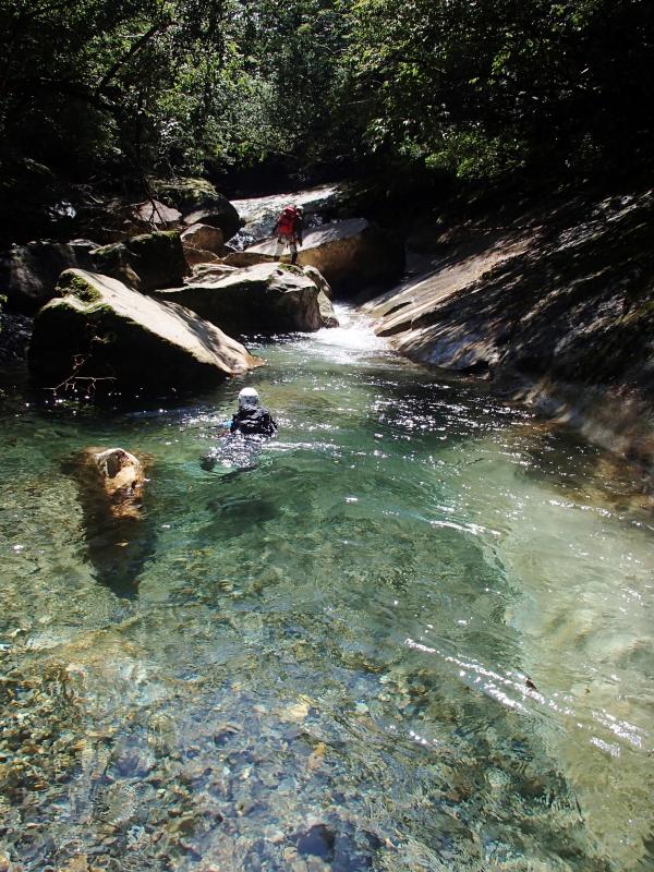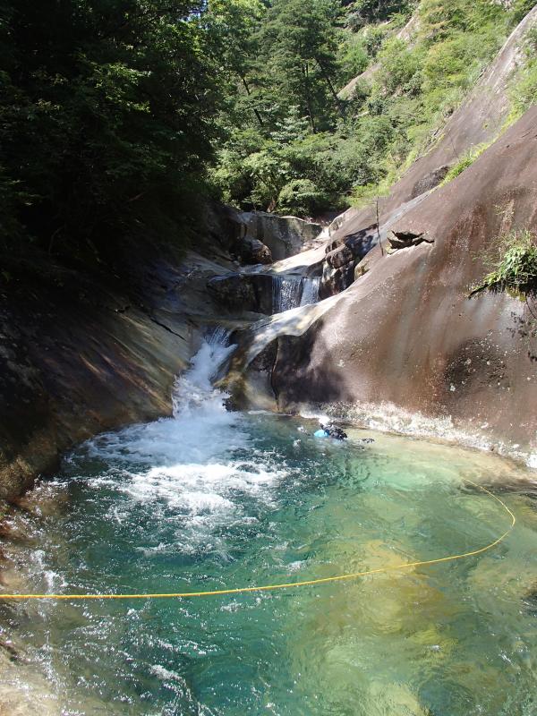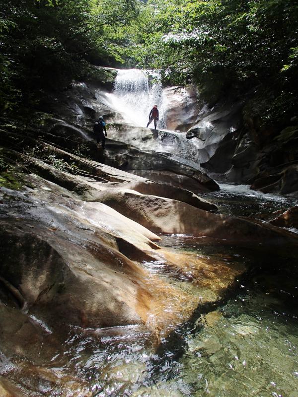 沢自体は水量もあり泳げる箇所もいくつかありますが、比較的易しく景観を楽しみながら歩けるでしょう。今回目標は奥にある観音滝でしたが、時間切れの為コシキ谷出合で引き返しました。出来れば時間的余裕をもって一泊することをお勧めします。