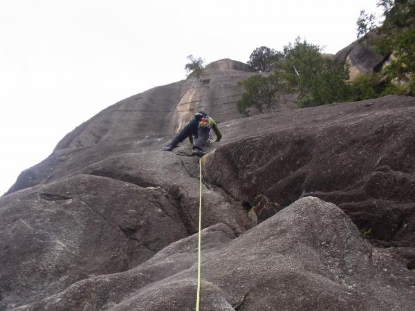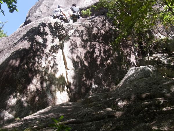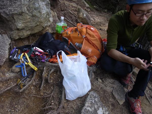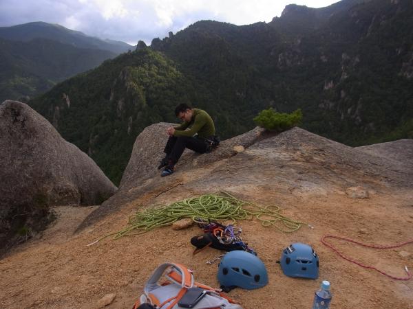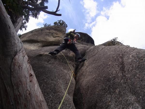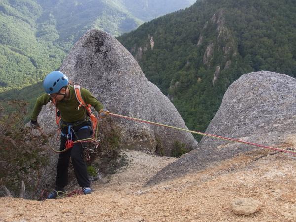 - 人気ルートでアンカーはしっかりしています。一部ランナーのハンガーナットがゆるくなっていました。下降のラペル 我々は細いロープで50メートル下降したところ、岩や立木との摩擦で回収に苦労しました。一本目の下降は短めにすると良いかもしれません(このピッチは登りかえしました)。