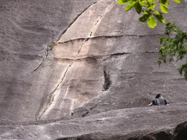 前に登ったガマルートとピッチグレードは近いですが、体感的にはかなり難しく感じました。一般的なスポートクライミングの感覚で取りつくとスラブではランナウトしていて戸惑うと思います。