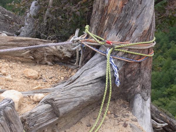 下降は最初のピッチは傾斜がゆるいため、回収時のロープの抵抗が大きくなります。すぐ下の立木でピッチを切ると良いと思います。