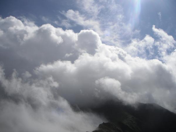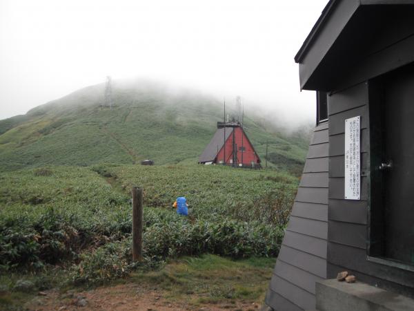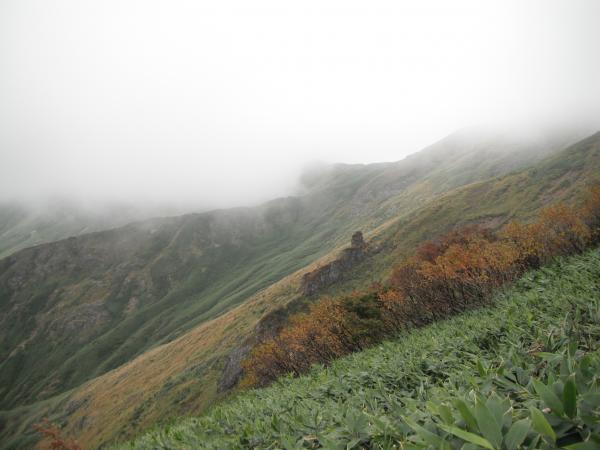 天神平から谷川岳は人気コースだけあって多くの方が歩いていました。が、天気は小雨模様。レインウェアを装備し歩き出しました。ああ、今日も雨の中歩くのか、とがっかりしていると、肩の小屋を前にして一瞬だけ青空が。草紅葉もきれいです。これは期待出来るか!?と思いきやトマノ耳から先はまた風雨が強まり、ただでさえ厄介な一ノ倉岳への岩場は難易度を増してしまいました。滑りやすい岩場を慎重に通過し茂倉岳へ。ここからは平和な道です。400m下って200m登り返しますが…。そしてついに武能岳を前にして、再びガスがとれ出しました。蓬峠に着く頃には明日歩く稜線や大源太山が見渡せました。管理人さん不在の蓬ヒュッテで一人酒盛りを楽しみ、冷え込む中、寝袋に入りました。。
