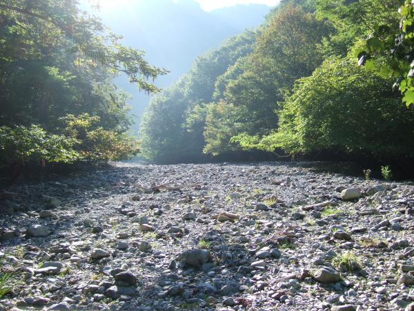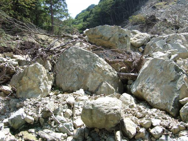 河原小屋は2011年の台風で流失。大岩が堆積していました。
