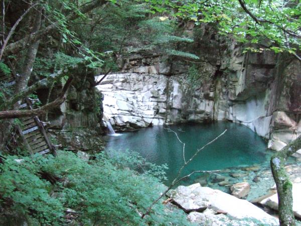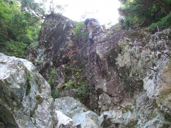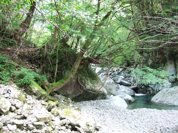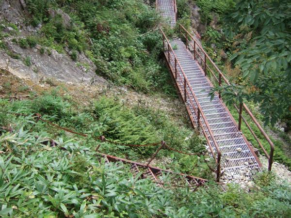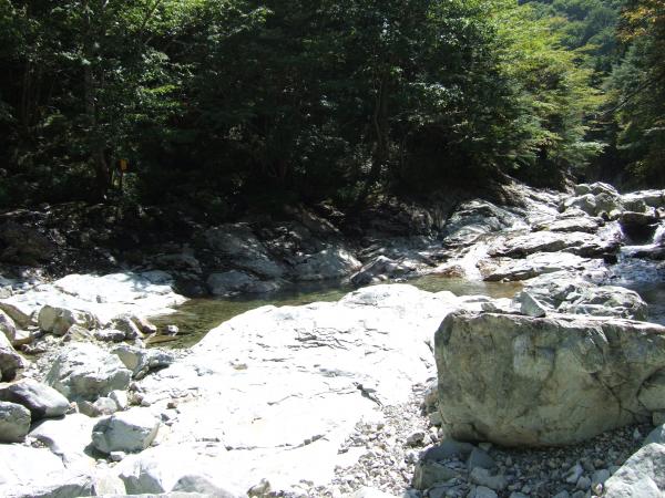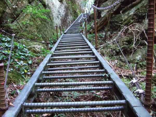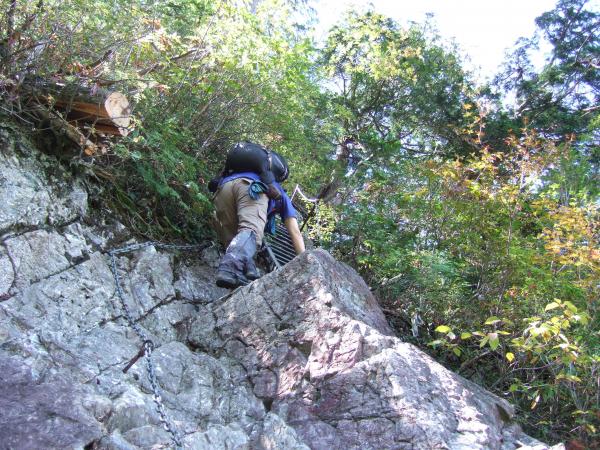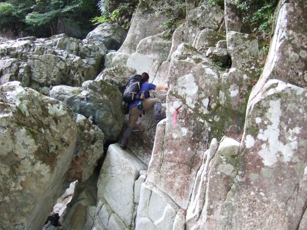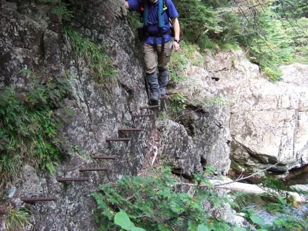 - 河原歩き、渡渉、ハシゴ・クサリ・鉄杭・・・全体に険路 川床の石の苔に注意