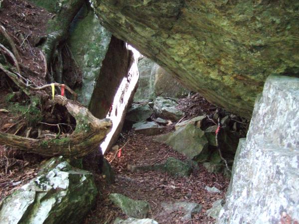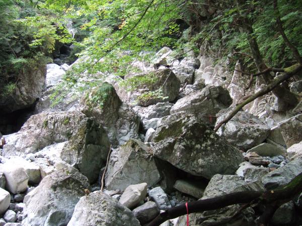 赤テープを追うと右岸、左岸と行ったり来たりするのでしんどかった。ルートを確認しながら歩くので
