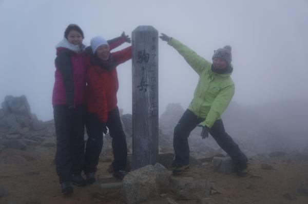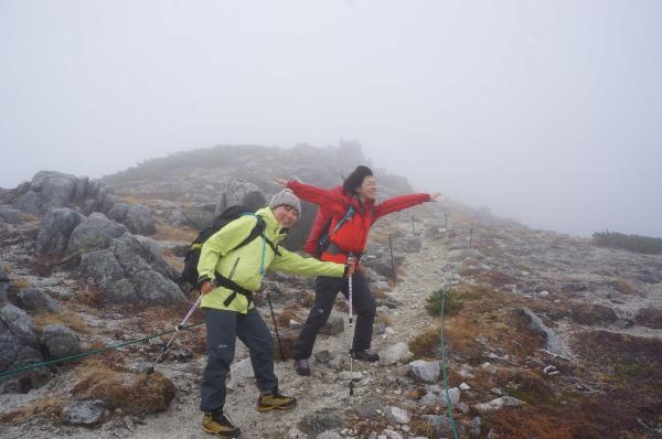 2日目はまさかの強風、真っ白なガス、時折雨・・・山頂でも朝日はまったく見られず。予定していた宝剣岳は危ないので通過せず、一度千畳敷に降りてから極楽平に登り返しました。檜尾岳までの稜線上もずっと風に吹かれながらの寒~いトレッキングでしたが、濁沢大峰あたりでは少し晴れ間や先の稜線も見えました><