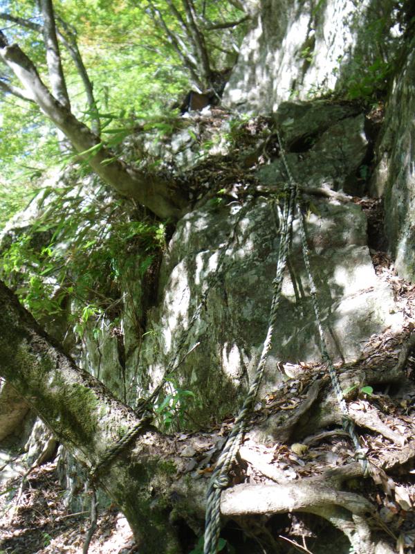 宮ノ谷コースは奥の出合まで沢沿いに進みますが、高滝までは橋が31箇所?、梯子が15箇所?と番号が振られている、川沿いの道ながらもものすごく整備されていると感じました。途中、橋の通行止区間で河原歩きがあり、増水時は注意。高滝の高巻道ですが、死亡事故発生の看板があるように、絶壁トラバースの登降があり、ロープが張ってあるにせよやや危険地帯です。猫滝やドッサリ滝を高巻いて、疲れたところに池木屋山中尾根の急登が待ち受けます。