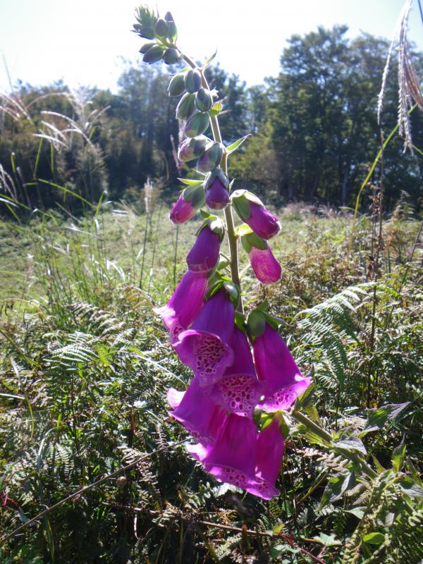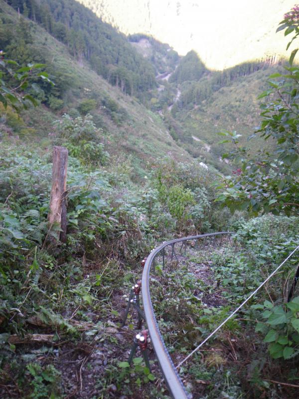 帰りはこの宮の谷コースは下りたくないので、池木屋山隣の霧降山(きりふりやま・1360m)経由の尾根コースで下る。展望はこの霧降山の方が抜群。霧降山からの尾根コースは点線コースだが、至る所でマーキングがあり迷わなく、しかも尾根のいい道です。しかし、尾根から離れ、いよいよ駐車地に下降する場面、鹿よけネットをくぐるまではいいですが、レール道沿いに歩き、途中で右へ進む地点がわかりません。何ヶ所か探しましたがイバラの藪に阻まれ、歩きにくい急なレール道をそのまま降りました。正しくは、鹿よけのフェンスを越えたところで、ネット沿いに右下へ進むようです。レール道を下ると最後は駐車場の手前数100mに出て、ほんの数分戻るだけです。レールを下りましたが、草もかってあり、藪よりましな気がしました。でも分岐は今から考えてもわかりませんでした。登り口はわかるので、登るとわかるのでしょうね。
