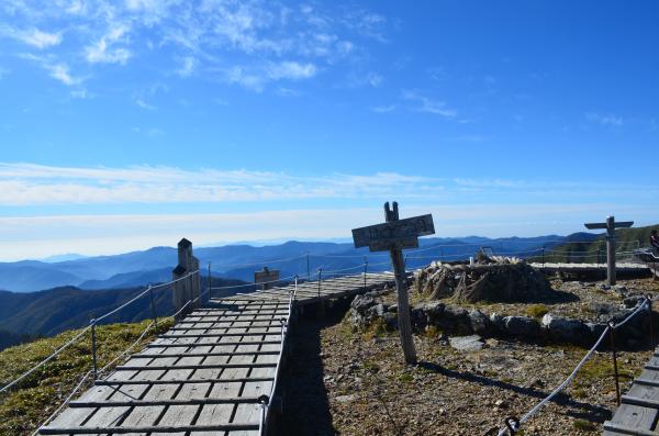 見ノ越登山口→56分→リフト西島駅→22分→大剣神社→18分→剣山頂上ヒュッテ→7分→剣山→96分→丸石→26分→丸石避難小屋→48分→高ノ瀬→92分→平和丸→34分→白髪避難小屋→45分→カヤハゲ→60分→三嶺 ※三嶺ヒュッテ泊