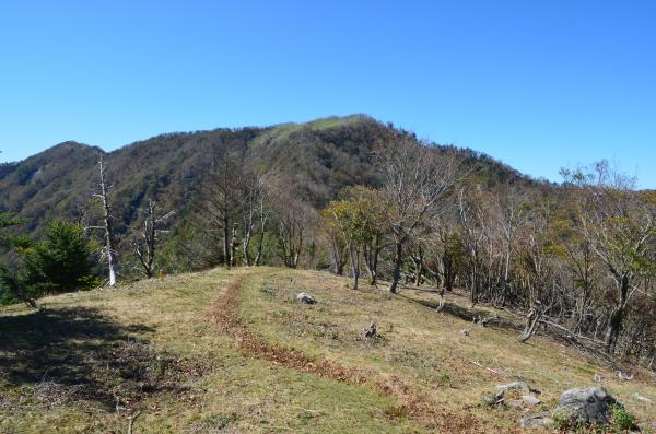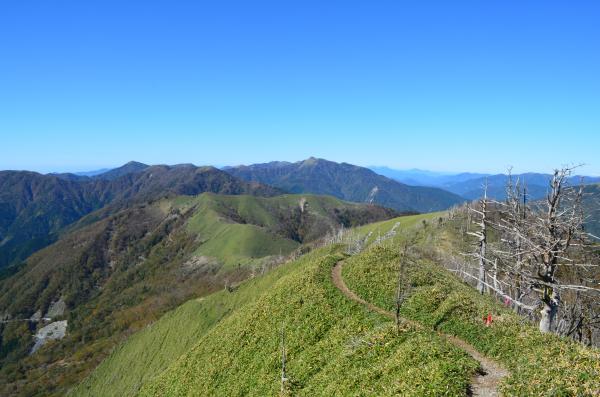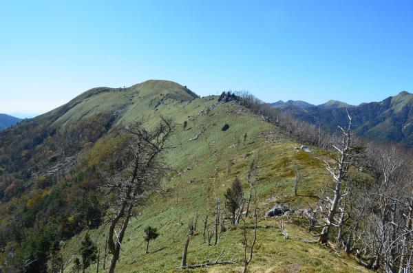 剣山から三嶺まで稜線がつながっていますが、それがL字になっており、剣山から西へ向かうと、三嶺の山頂とこれから歩く道をずっと眺めながら歩くことができます。