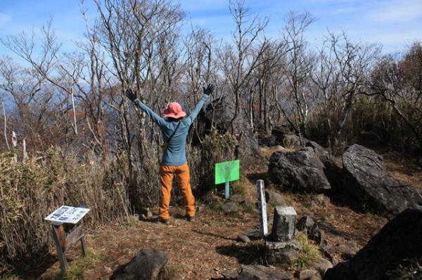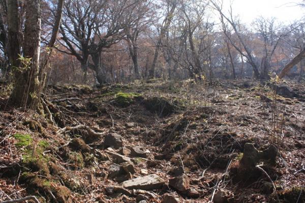 上ワク塚から先は、秋で木の葉が落ちているので、ルートが分かりずらいですが、上の方をめがけて上っていきます。山頂に近づくと両方がスズタケの中の道でアップダウンが少なくなるので、安心して歩けます。