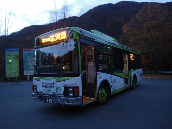 今回は市営芦安駐車場に車を停め、6:00発の広河原行きのバスへ乗りました。夜中1時半頃に駐車場に着きましたが、平日にも関わらず駐車場には車がすでに数十台ありました。(乗り合いタクシーもあるので、バスには問題なく乗れます。)