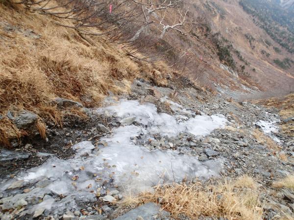 先日ついた雪はここ数日の好天候で溶けていたので、軽アイゼン+ストックの装備で向かいました。天候が崩れると一気に雪山になるこの季節、事前の天候や登山道の情報収集はとても大切です。