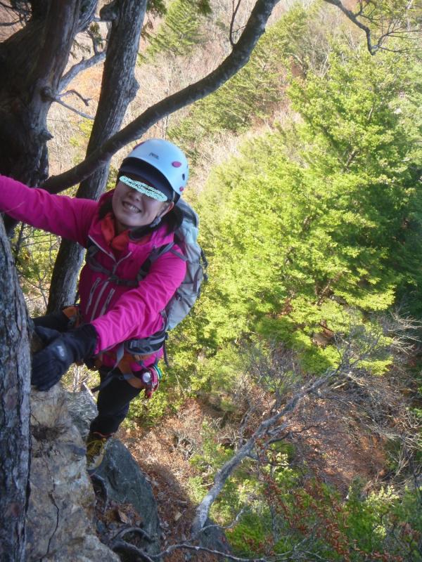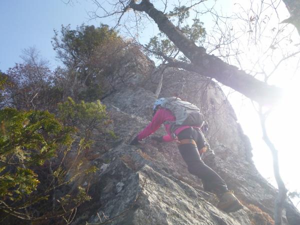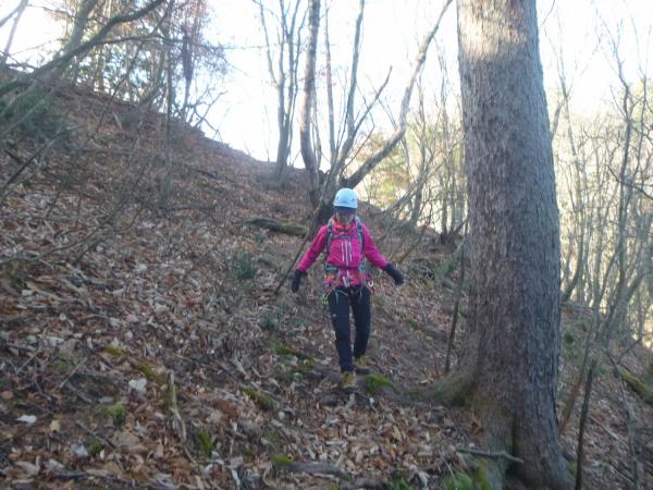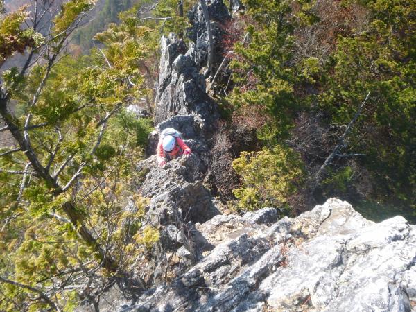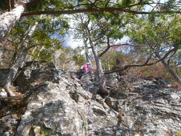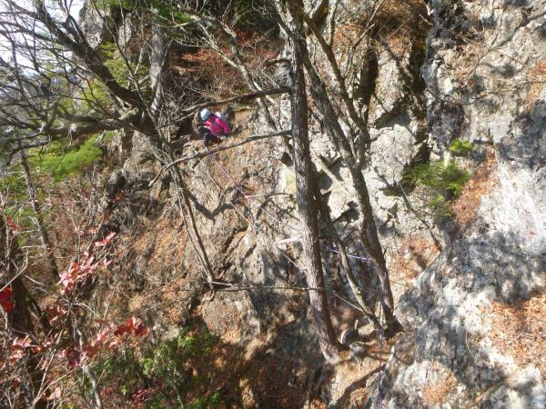 赤岩尾根は両神山につづく尾根で、ルートファインディングや岩登り技術を要するバリエーションルートです。私たちは30mザイルを持っていき、固定ロープが劣化しているトラーバースのところで使用しました。