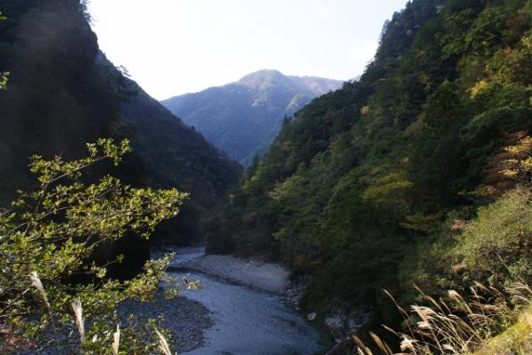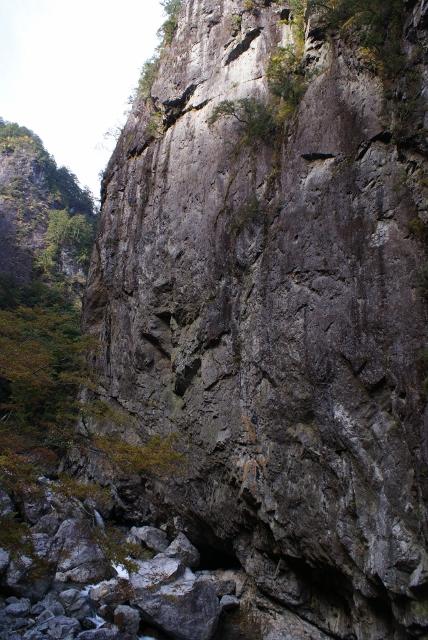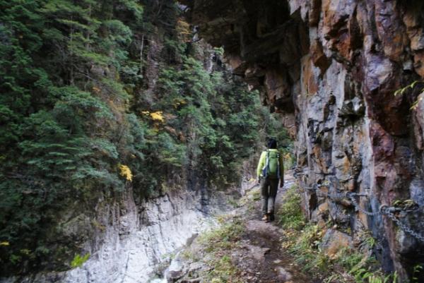 一日目は宮川第三発電所から桃の木山の家まで歩きます。発電所をこえてすぐに、谷沿いの岩を切り開いてつくられた登山道を歩きます。