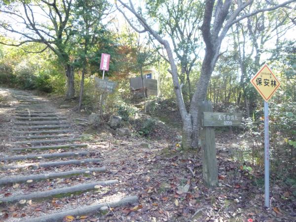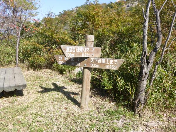 - 鳥居側登山口(15分)東屋(10分)分岐 1(15分)分岐 2(5分)展望台(3分)分岐 2(15分)天下台山 山頂(15分)分岐 1(7分)東屋(10分)鳥居側登山口