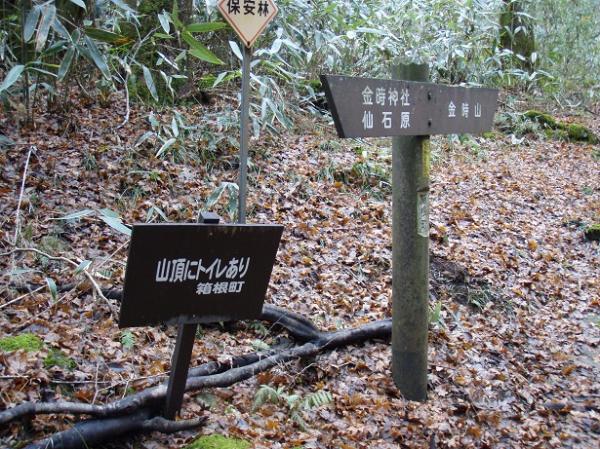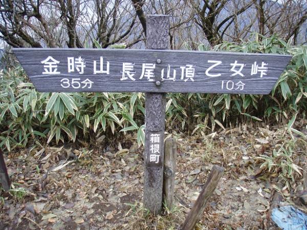 - 公時神社駐車場➡(30分)➡明神方面分岐➡(30分)➡猪鼻嶽(金時山)➡(30分)➡長尾山➡(10分)➡乙女峠➡(30分)➡道路➡(5分)➡公時駐車場