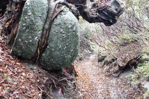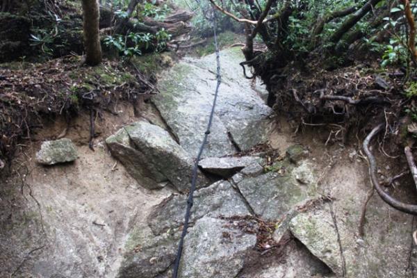 雨のため下りの岩場は、慎重にすべきですが、屋久島花崗岩は粒子が荒くざらざらしているとこもあり滑りそうで滑らない個所もありました。しかし、調子に乗ってるとズルッといきます。木道は当然滑りますので注意してください。