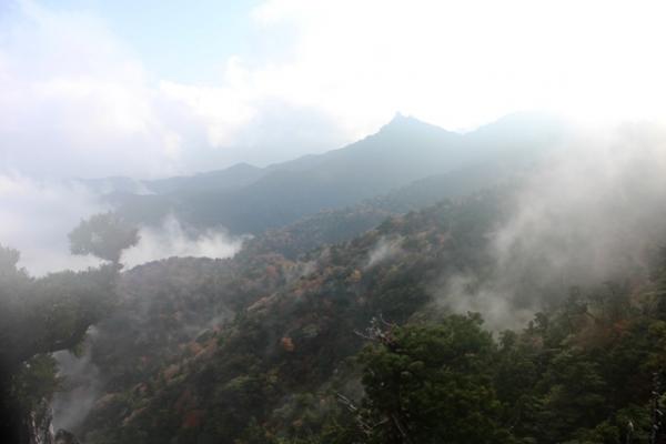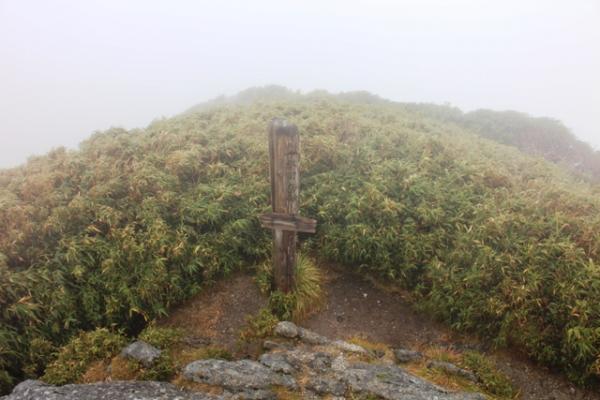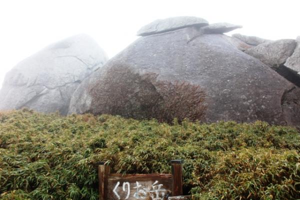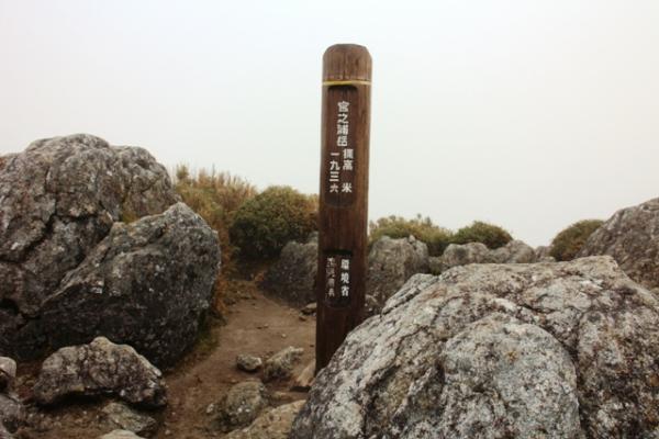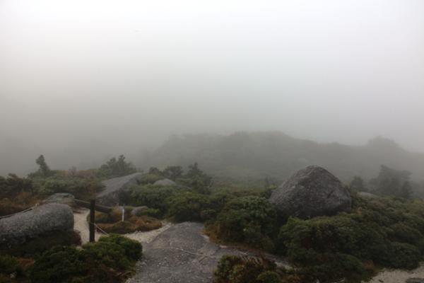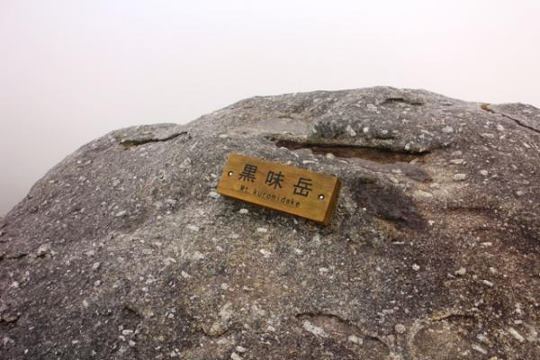 翌朝も淀川小屋から雨の出発でした。雲の合間から一瞬でも眼下を眺められれば、と期待しましたが、黒味岳、宮之浦岳、永田岳、すべてガスにより、山頂からの景色や、山の全貌さえ見ることができませんでした。