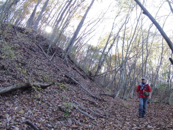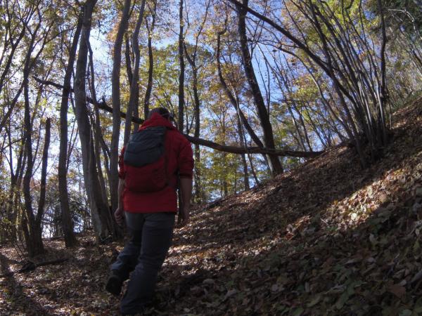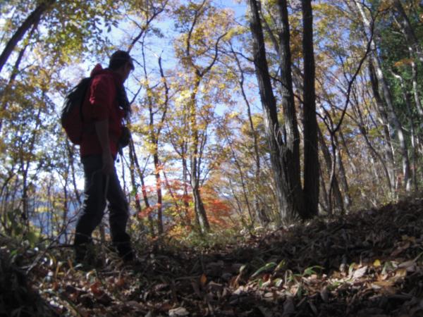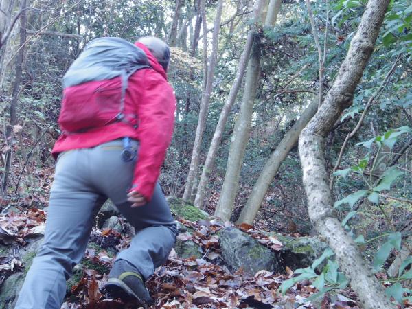 登山靴大の浮石が落ち葉の下に隠れているので注意深く足を置く