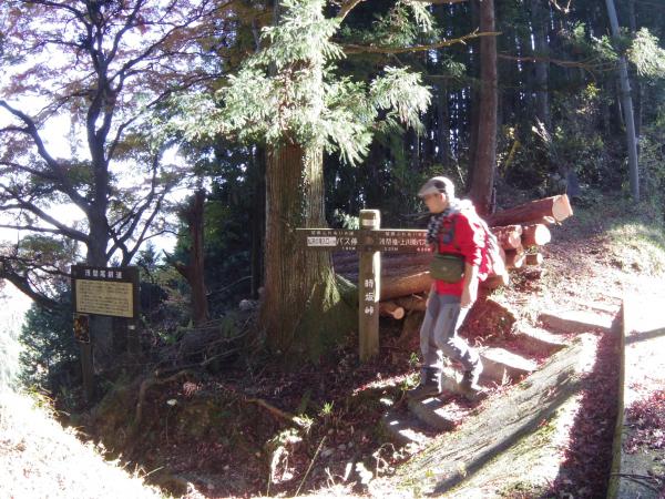 観光スポットの払沢の滝の石碑裏から尾根に取付きます。