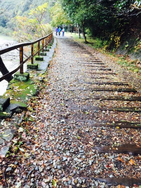 平坦路ですが、砂利や枕木で足をとられるので、底のしっかりしたローカットシューズかミッドカットの靴があった方が楽です。