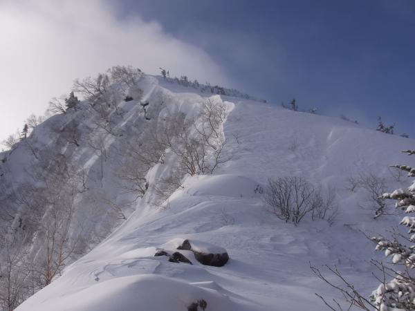 1ピッチ目はドライの色合いが強い。2P目、出だしのスラブの立ち込みがワンポイントでイヤラシイが後は緩い雪田で楽チン。3P目が正面の凹角にルートを取った。中間部がスタンスの乏しい垂壁な上に残置支点も乏しくキビシイです。