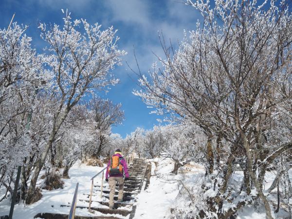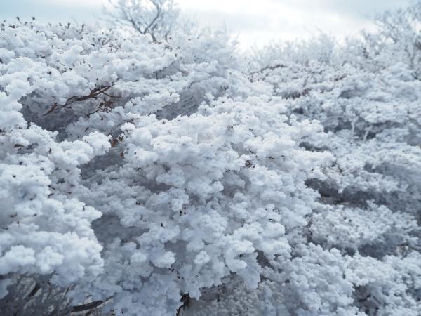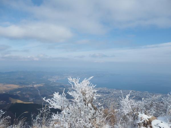 と、そんなこんなしているうちに山頂広場へ。一気に視界が開ける。おぉーーー、別府湾が一望だ。反対側には由布岳も見える。そして木々には霧氷がびっちり。この景色がロープーウェイに乗れば簡単に楽しめるのだからすごい。本当は沢山の人に自分の足で登ってほしいところだが、、、