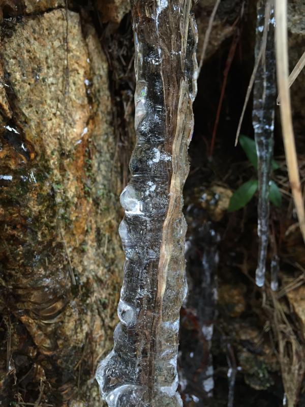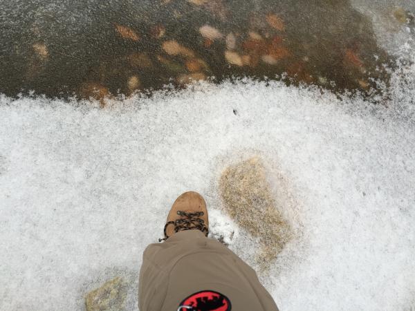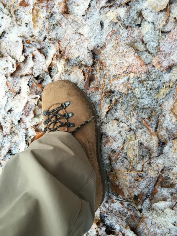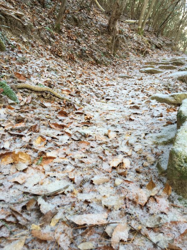 - 落ち葉の上に雪が軽く乗っている状態。気温が低いため、濡れる事はなかったですが、上がるにつれて滑りやすい場所もありますので、アイゼンは必携です。