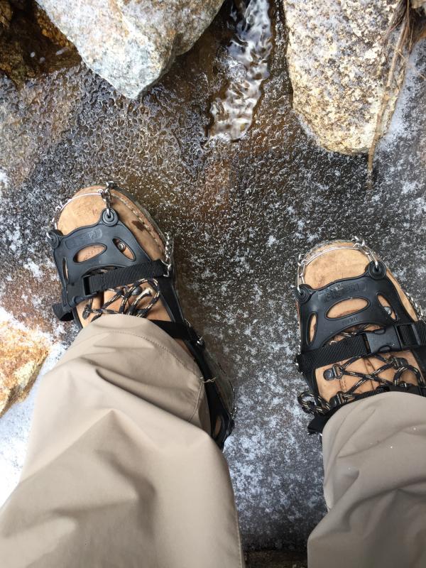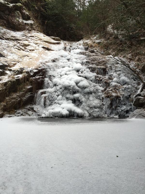 寒波の影響で寒い日が続き、今朝は小雪が舞っていましたので、六甲の雪景色のチャンスと思いたち、ホームコースでもある大池地獄谷へ行ってきました。雪はうっすらと降り積もっているだけでしたが、沢沿いは凍っているところもあり、チェーンアイゼンが大活躍でした。地獄大滝がすでに凍っているとは思っていなかったのでびっくりしました。上の方は木々に雪が積もって綺麗でした。まだまだ深い雪ではないですが、これからのシーズンは低山といえどもアイゼンは必携です。早朝は0度近い気温でしたので、上はメリノウールアンダーにフリースのジップネック、ソフトシェル、ライトダウン、下はメリノウールタイツとソフトシェルパンツを合わせて、歩き始めて暑くなってきた頃にダウンを脱ぎました。サーモスの山専ボトルにあたたかいコーヒーを入れていきました。冬の休憩時にはあたたかい飲み物が一番いいですね。