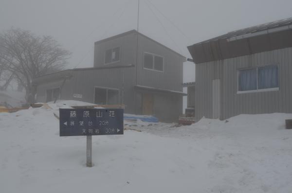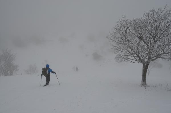藤原山荘から山頂へ向かいますが、視界が悪いので、トレースがなかったら道に迷いそうです。