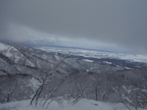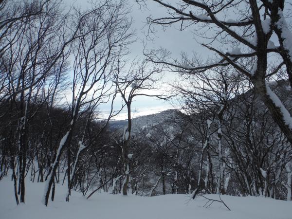 天気は生憎の曇天でしたが、それはそれで新潟の冬空らしく、静寂の中に自分の呼吸と雪を踏む音と、時折鳥の鳴く音だけが響いていました。晴天の冬山も良いですが、しんと静まり返った曇り空の雪道を歩くのもなかなかオツなものです(^^)振り返ると明るい新潟の街並みが一望でき、ここと違って下界はどうやらお天気が良いようでした。
