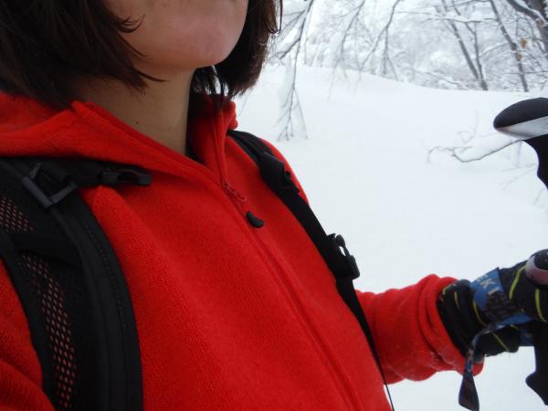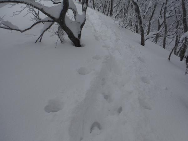 標高が上がるに連れ風が出てきて、頂上付近はすっかり雪雲に覆われています。七合目で小休憩、そこから少し進んだところで雪が深くなってきたので、今年初!のスノーシューを装着。浮力も増してどんどん進みます♪しかし雪がちらついてきてしまい…山頂は無理でも避難小屋までは何とか行けるかななんて思っていると、先行者の方が続々と下ってきました。聞けば、この先で完全にトレースが無くなり行き止まりになっているとのこと。とりあえずその場所まで行ってみましたが、本当に道がぱったりと途絶えていました。腰までのラッセルを10分程試みましたが、道ははっきりせず辺りは完全に吹雪となり、何より大変心細かったのでここで断念、下山することにしました…。