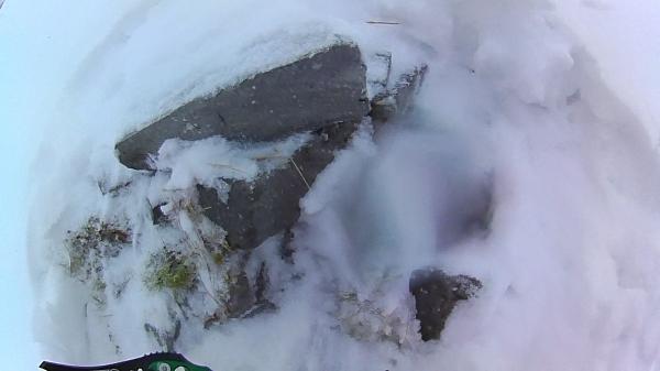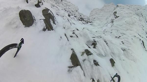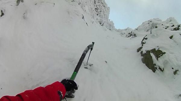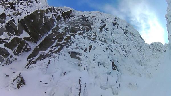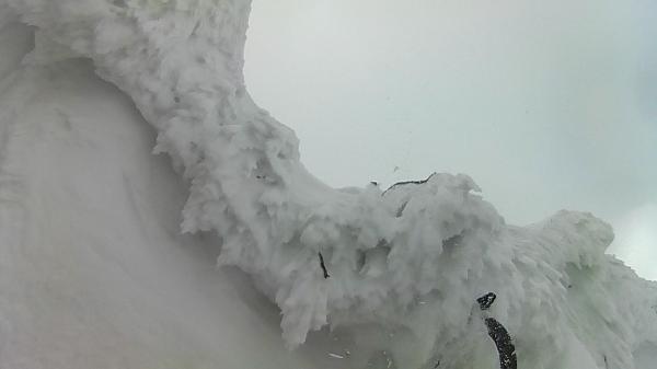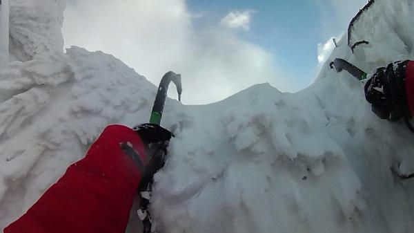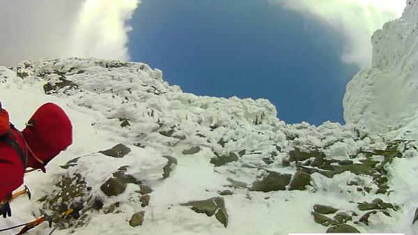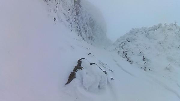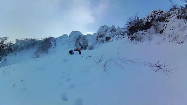 三鈷峰西壁取り付きまで、わかんは必要なし。三鈷峰西壁は氷結した箇所は少なかった。